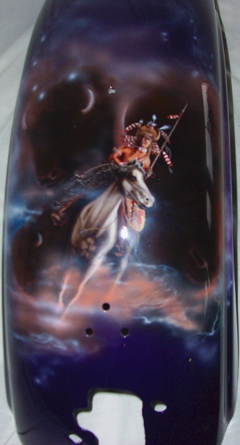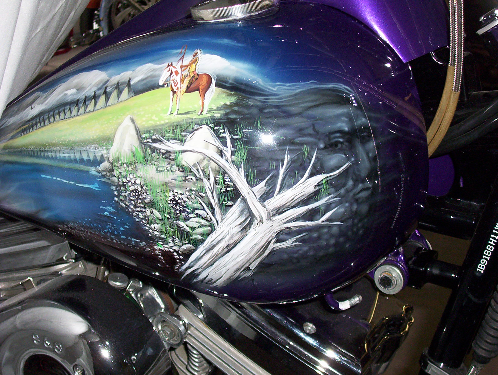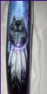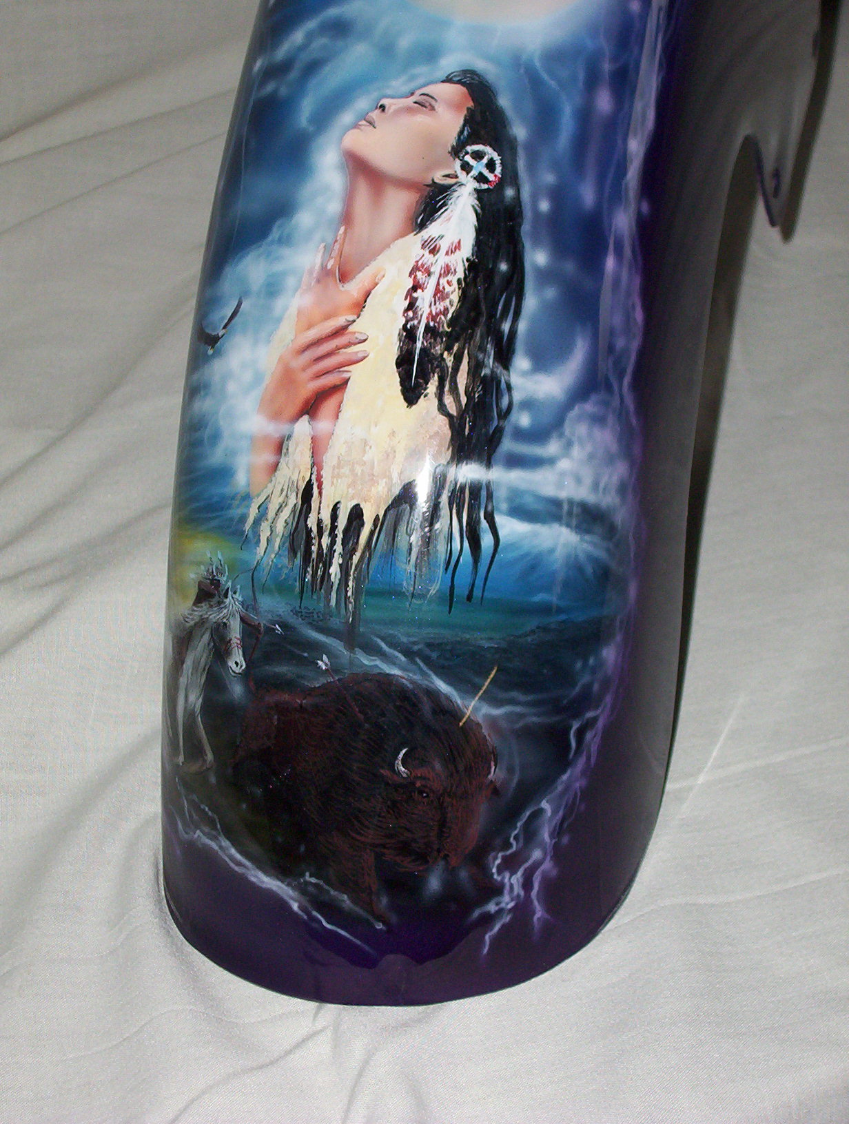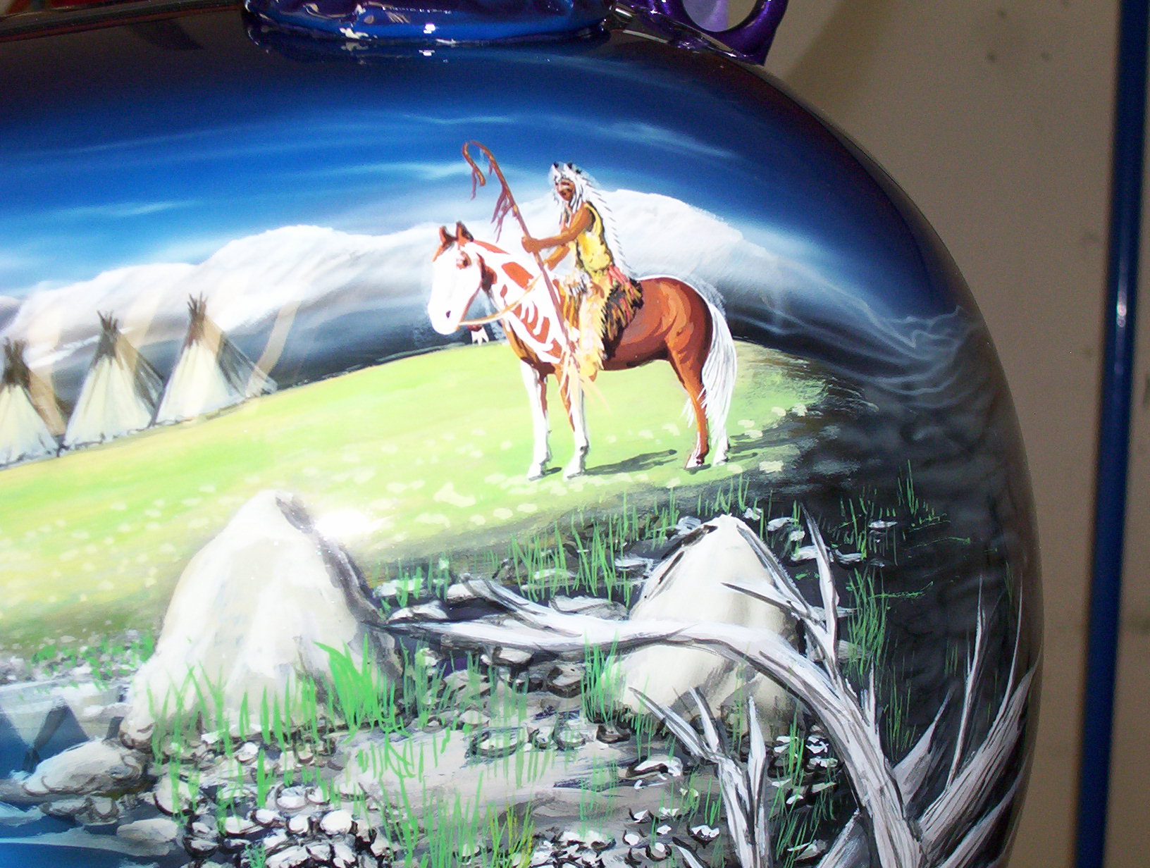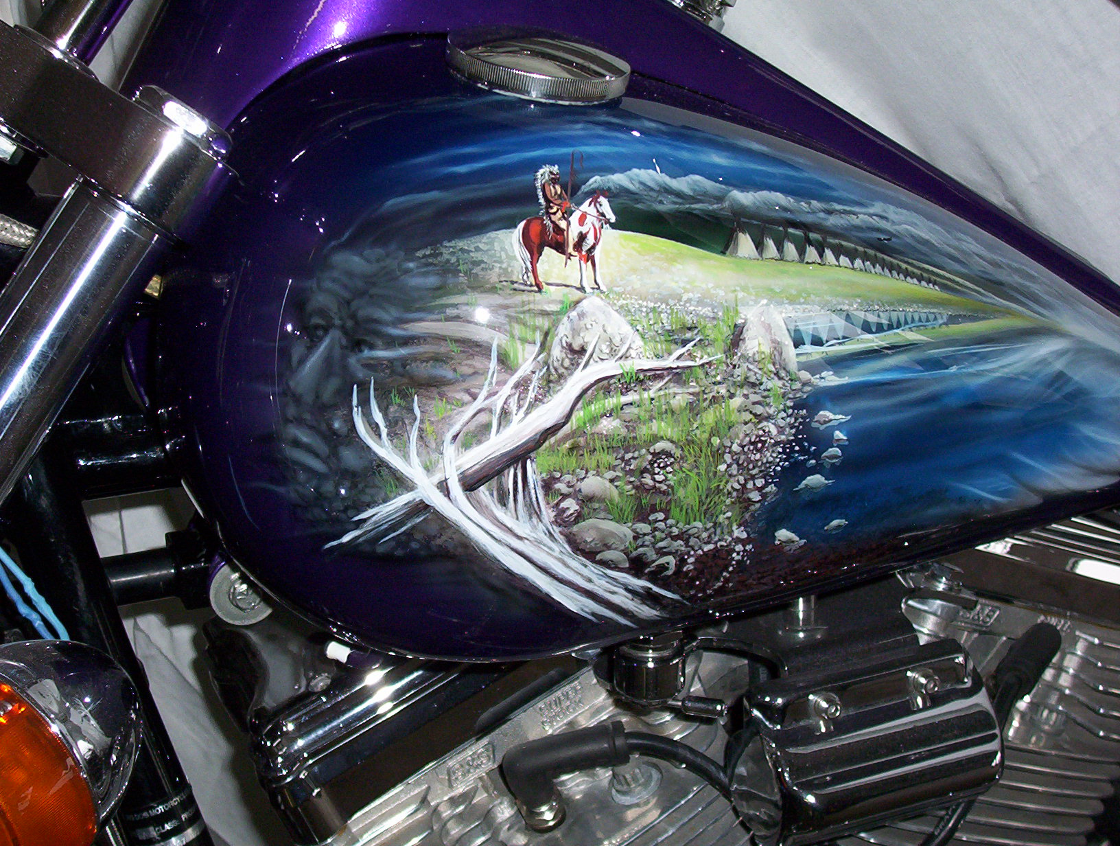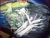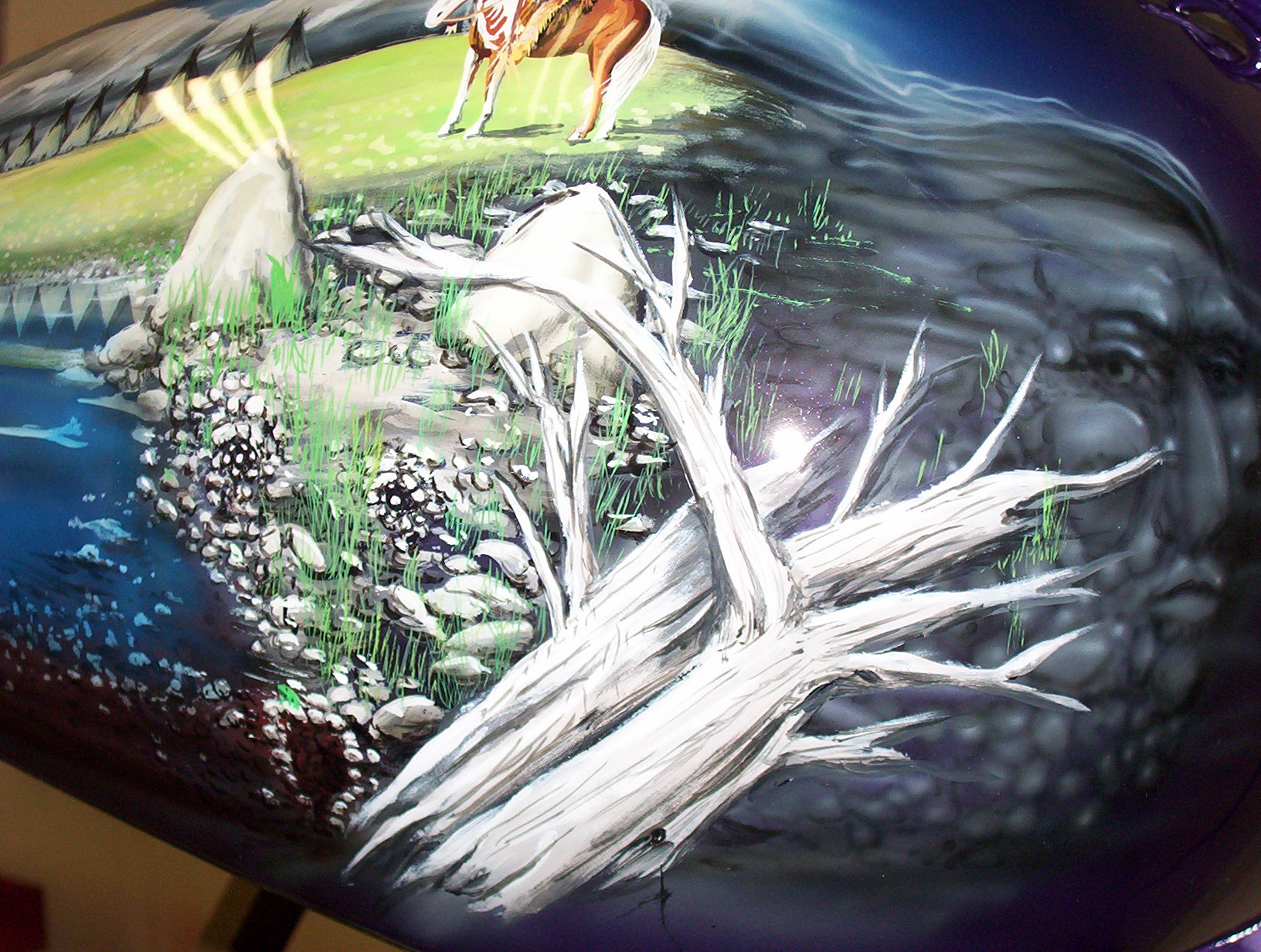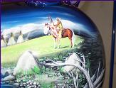 As you follow along the side, there is a host of things going on, the chief surveying his village next to a lake with the moutains in the background and eagles flying about , a wolf's head depicted in the rocks and then the scene trails off into eagle feathers.