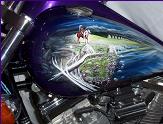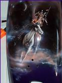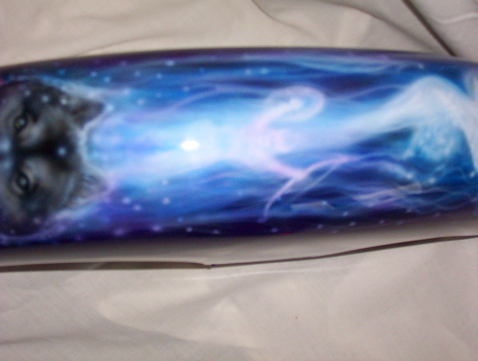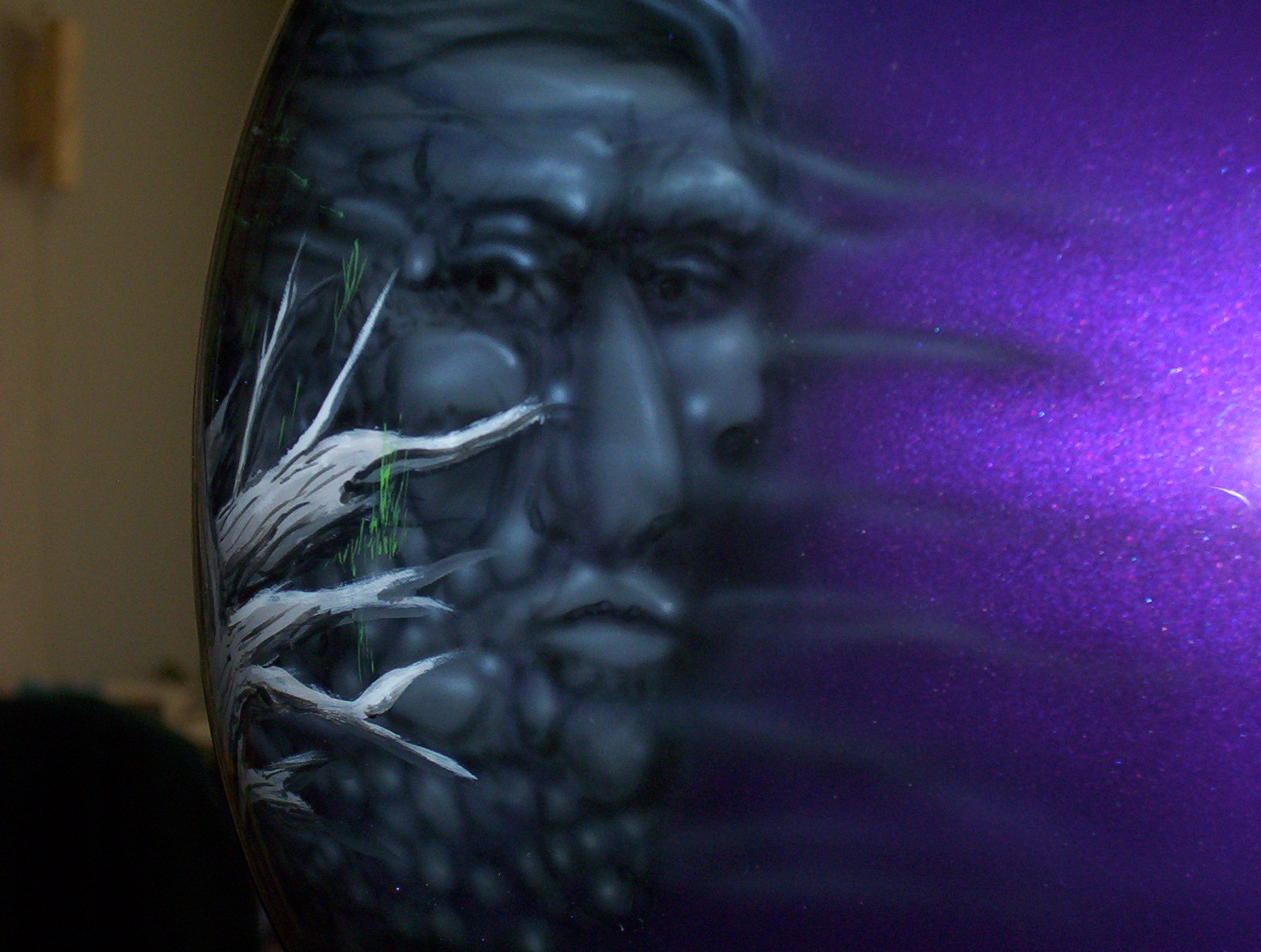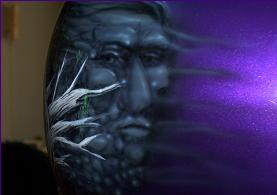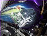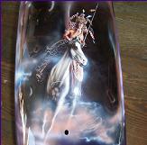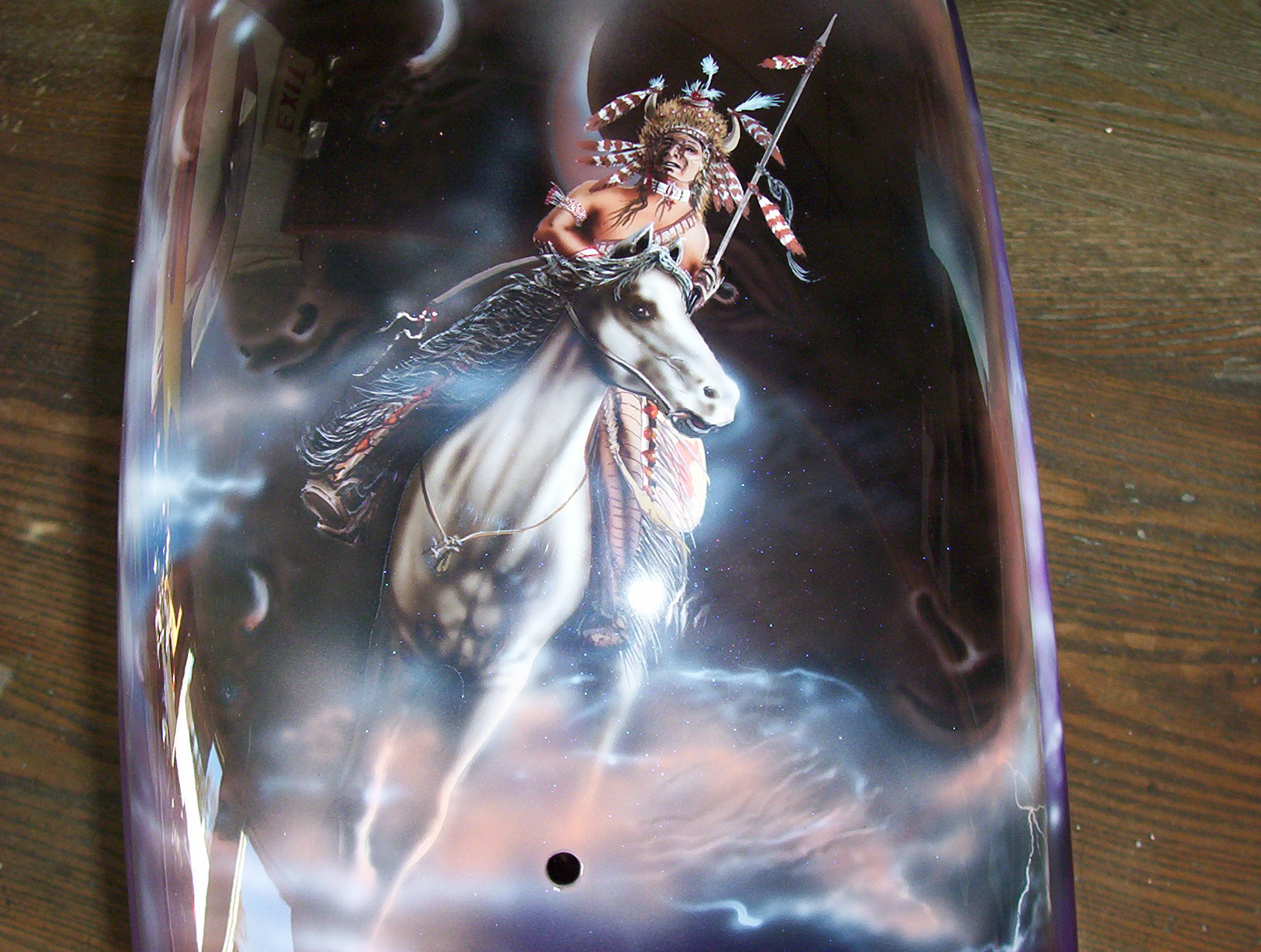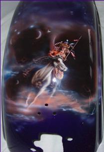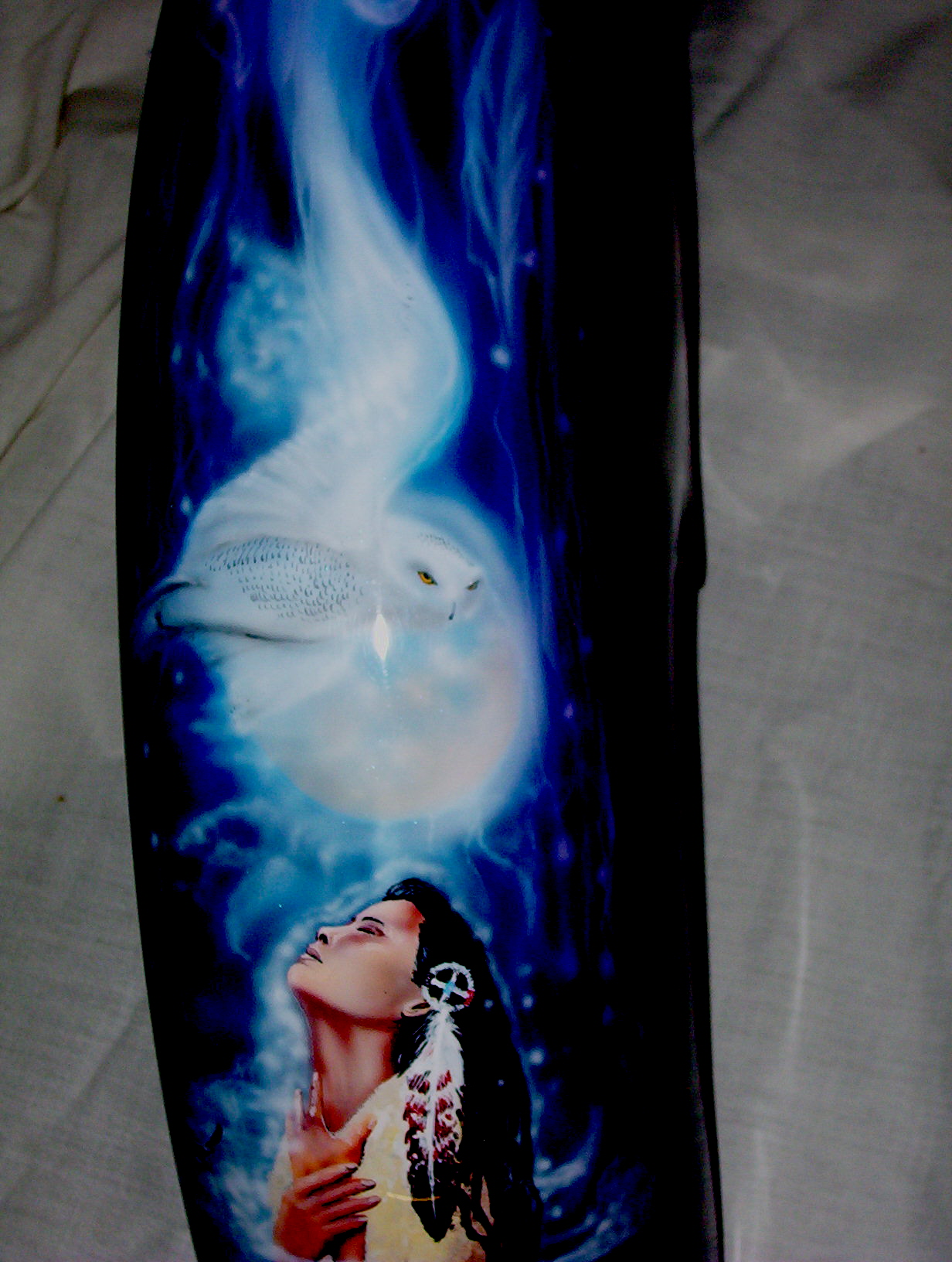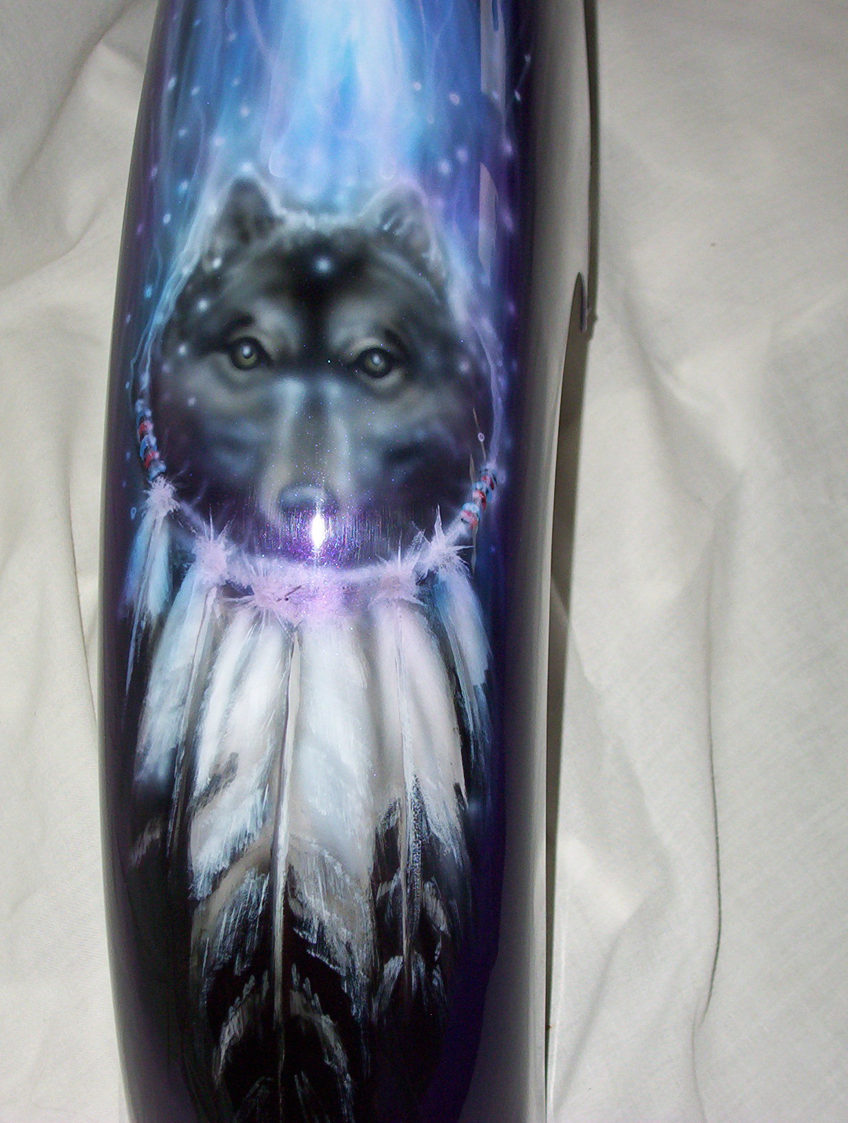 As you follow along the side, there is a host of things going on, the chief surveying his village next to a lake with the moutains in the background and eagles flying about , a wolf's head depicted in the rocks and then the scene trails off into eagle feathers.