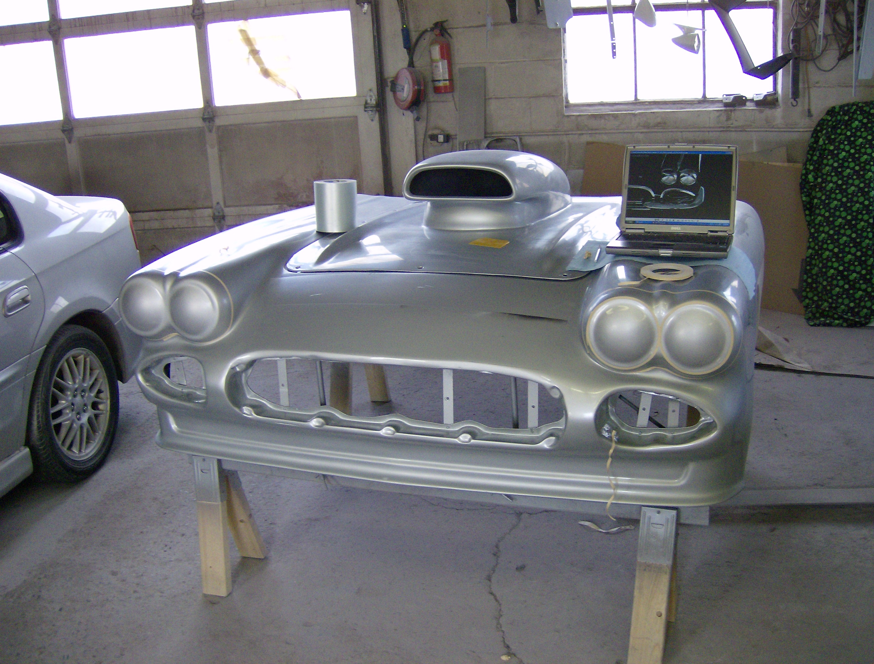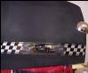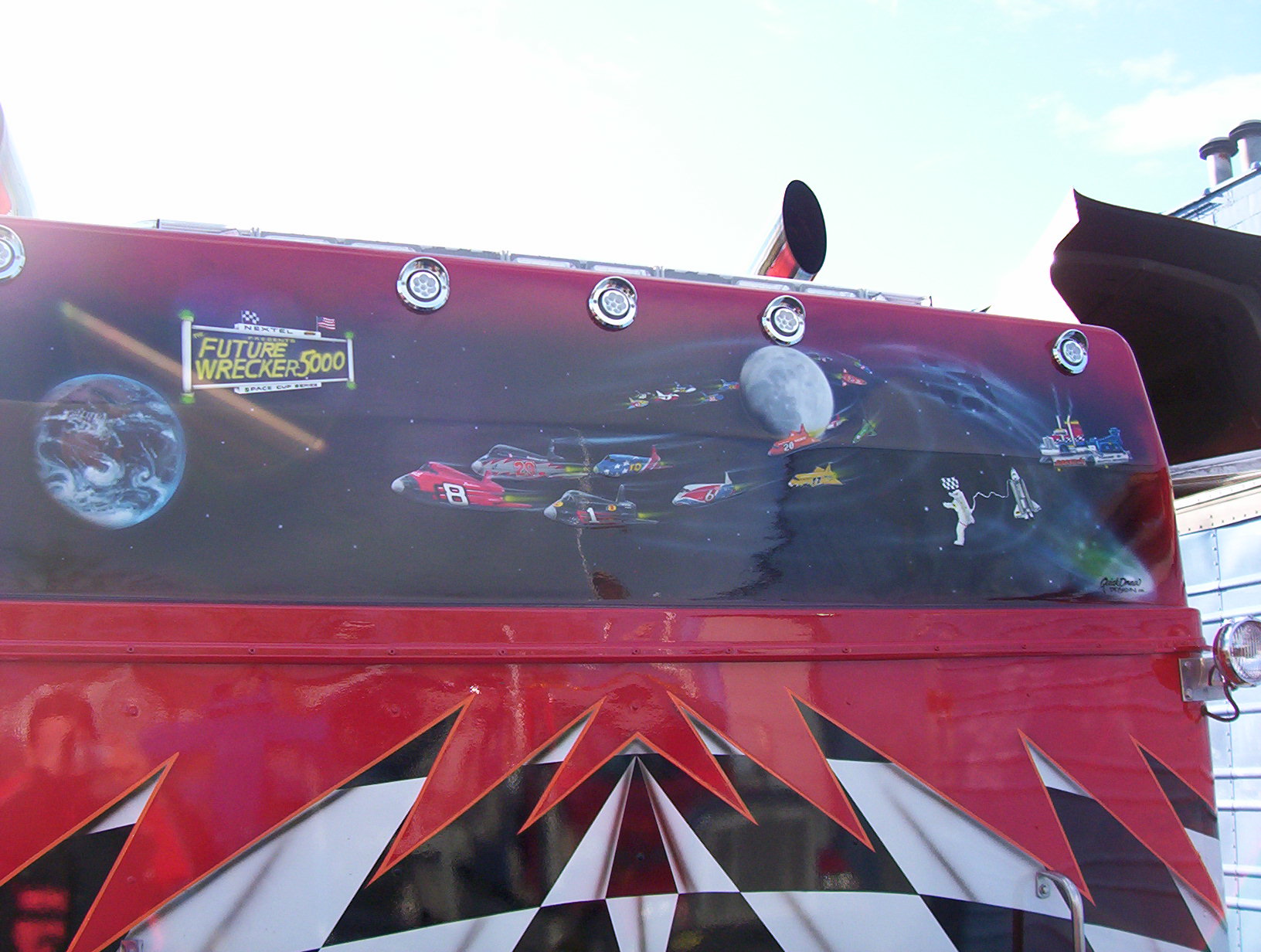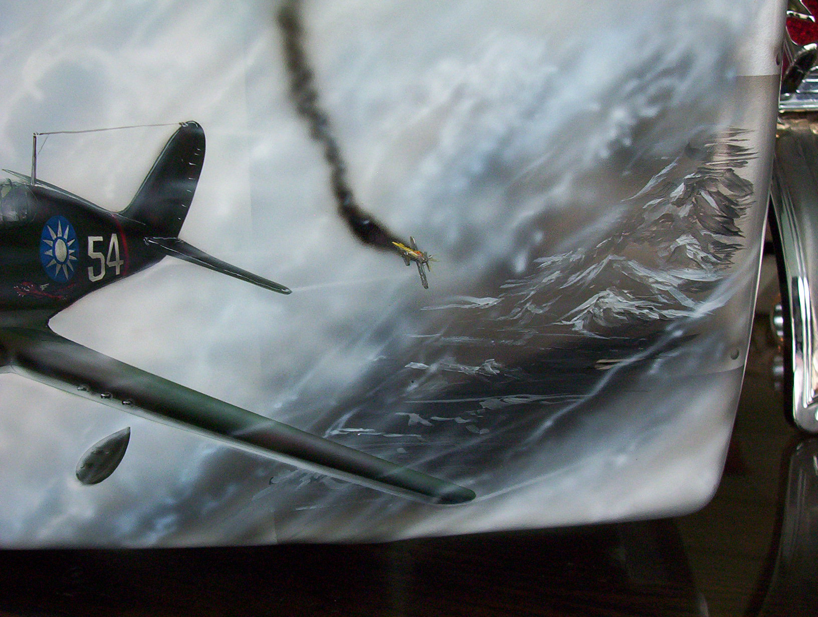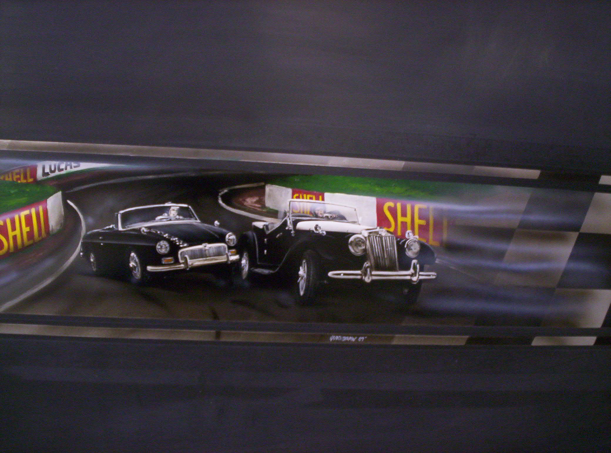 2 MG's racing. Painted on the hood of an MG. Pencil indicates the size of the art.