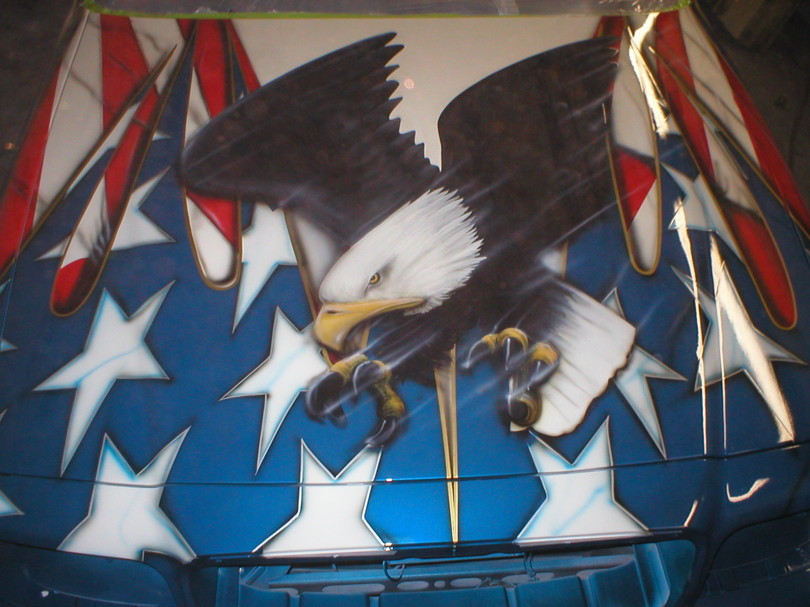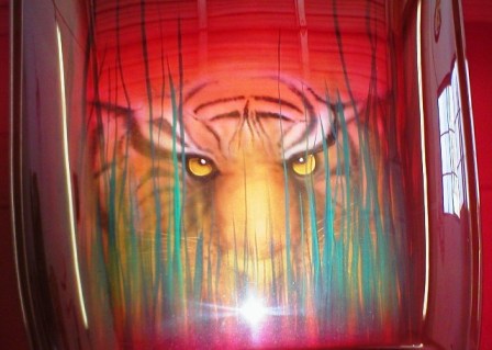 Airbrushed tiger on a hood scoop.